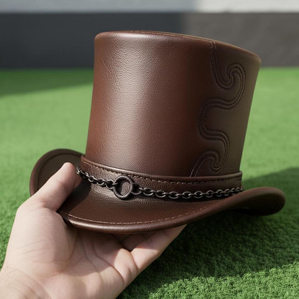 Handmade Brown Leather Top Hat Embossed Chain Band Steampunk Cosplay