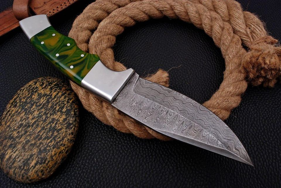 Handmade Carbon Steel Hunting Skinner Knife with Partially Serrated Edge Resin Handle Full Tang Blade Natural Leather Sheath