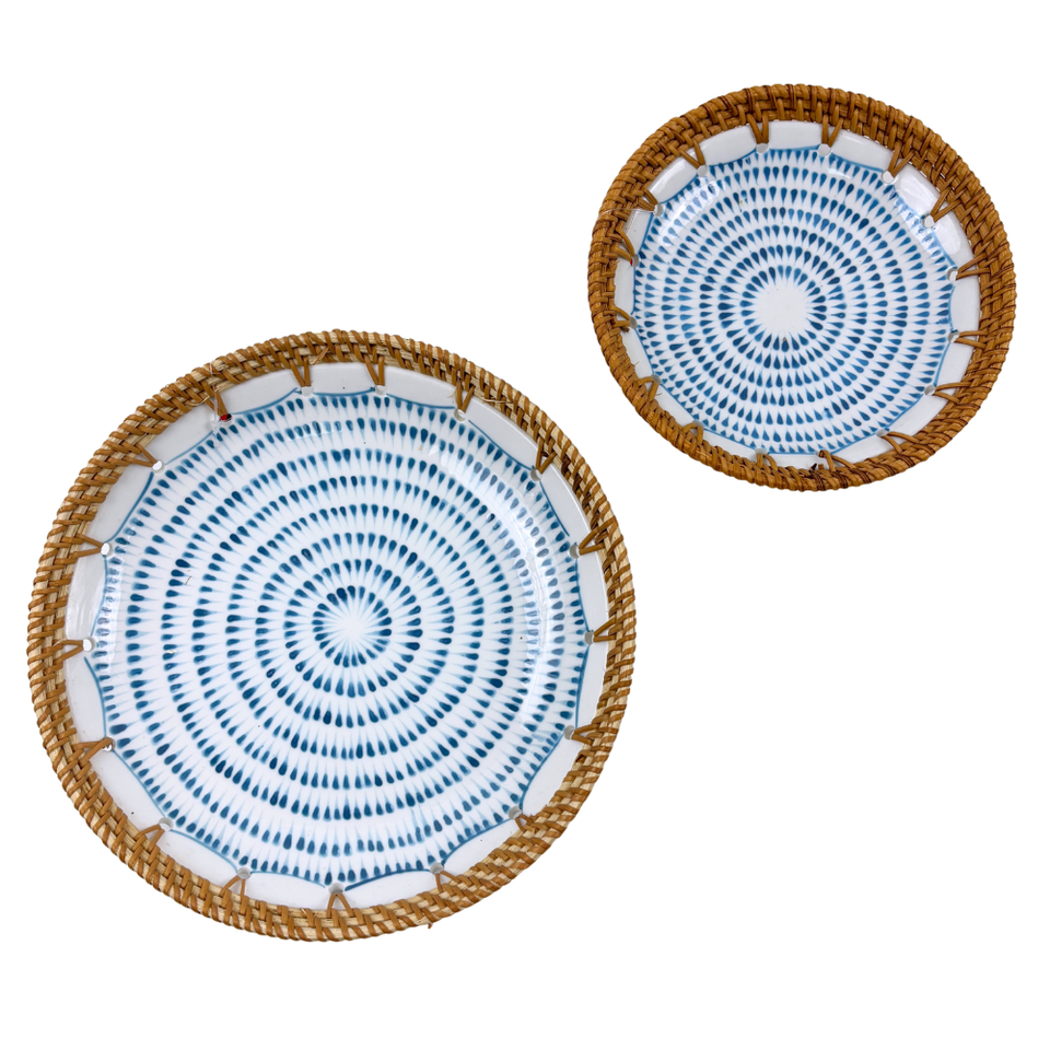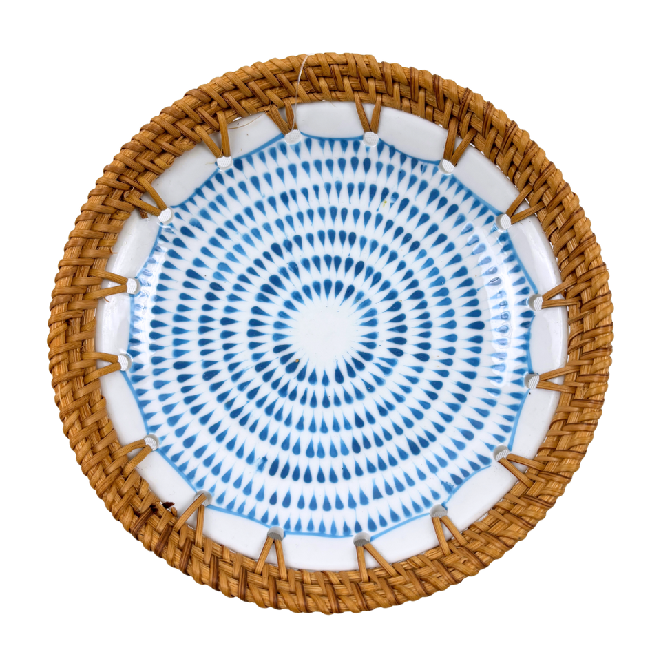 Handmade Ceramic Vintage Durable Serving Bowl Eco-Friendly Rattan Woven Edge Decorative Blue Dot Spiral Pattern Home Kitchen