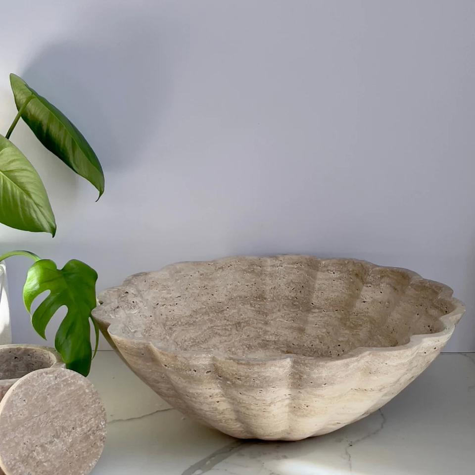 Handmade Classic Beige Travertine Bowl Scallop Natural Stone for Home Decor Fruit Serving for Kitchen Living Room Wall Cladding