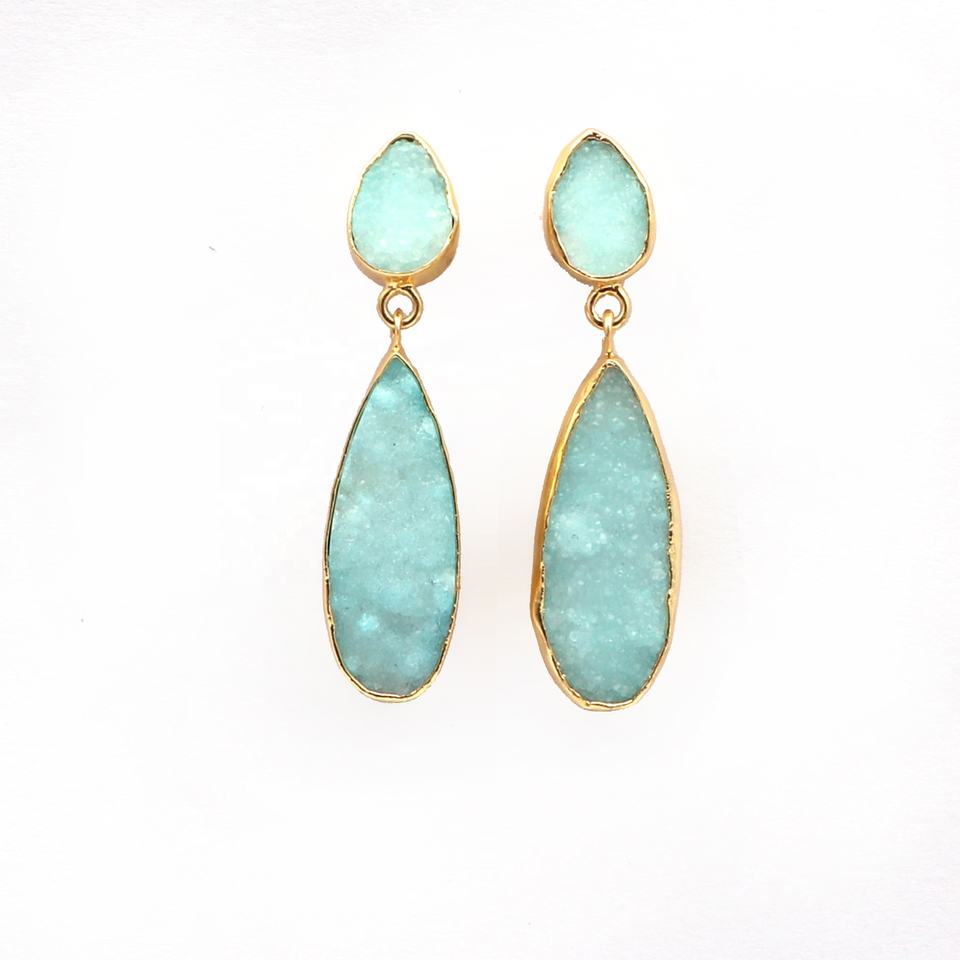 Handmade Classic Drop Stud Earrings with Sugar Druzy Gemstone Gold Plated Brass Party Jewelry for Women