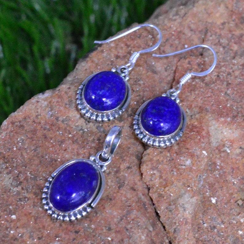 Handmade Boho Style 925 Sterling Silver Classic Pendant Earrings Set with Lapis Gemstone Gold Plated Wedding Gift for Sister