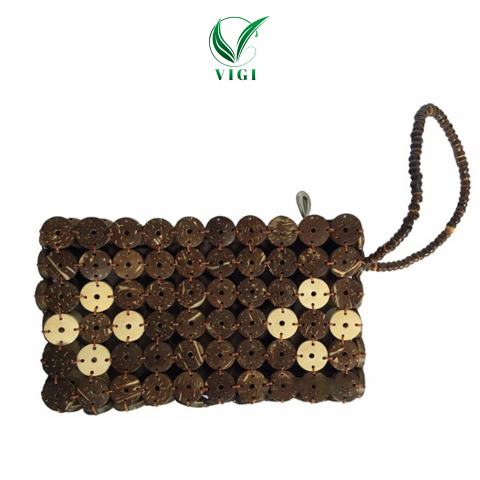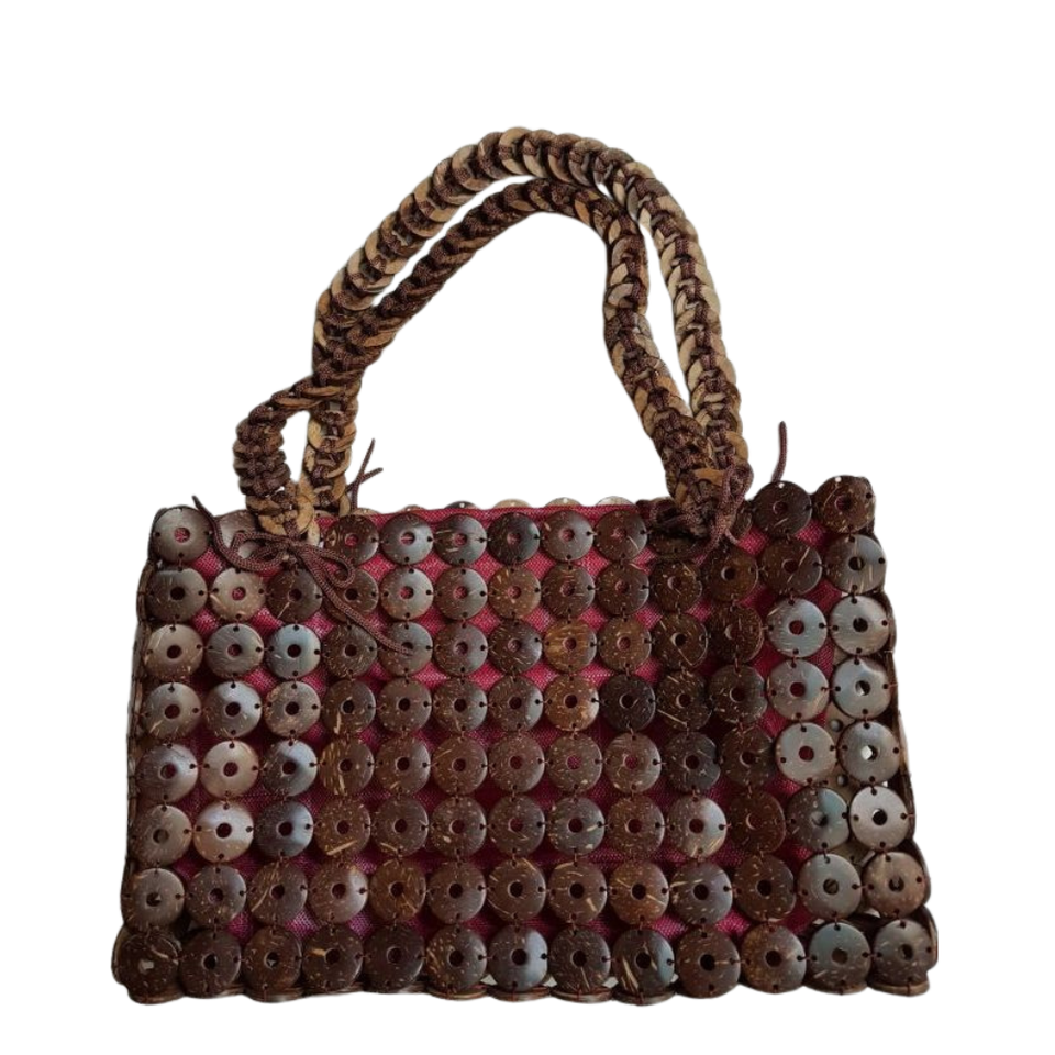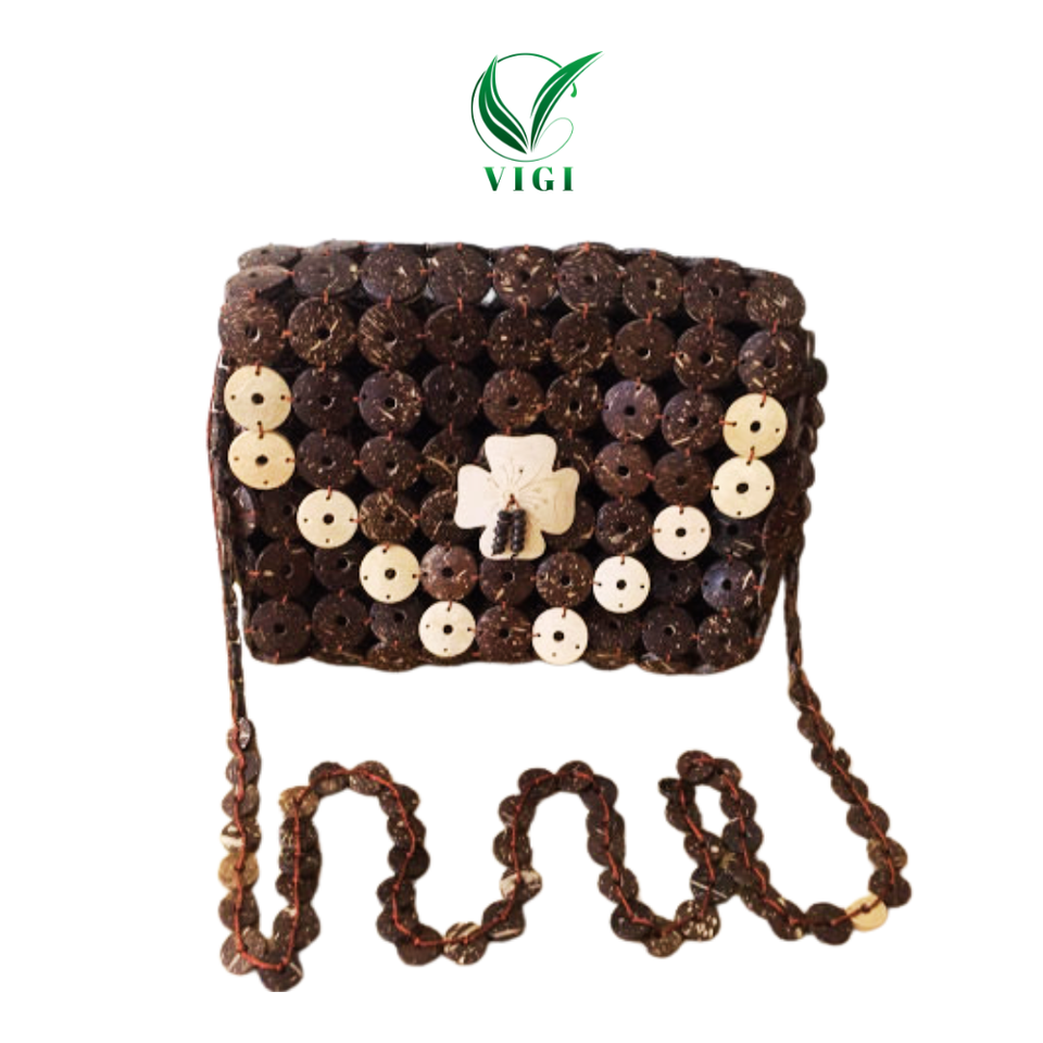 Handmade Coconut Shell Women's Tote Handbag Unique Vietnamese Style Floral Decoration Zipper Closure Dual Straps Canvas Lining
