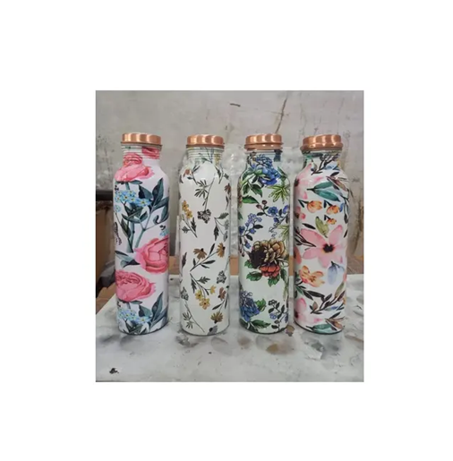 Handmade Copper Water Bottle Reusable Natural Polished Printed Design Features Stainless Steel Lid-Free Shipping