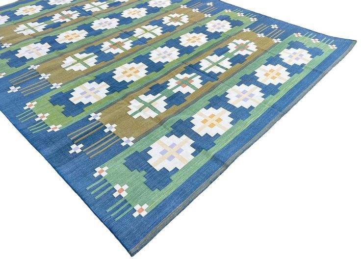 Handmade Wool Dhurrie Area Rug Flat Weave Eco-Friendly Anti-Slip Reversible Green Blue Geometric Indian Design