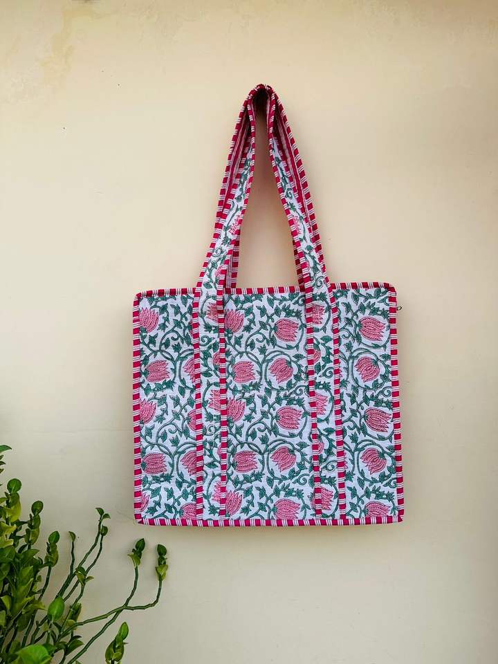 Handmade Cotton Floral Block Print Small Quilted Tote Bag Women's Summer Gift Floral Style Bag for Her