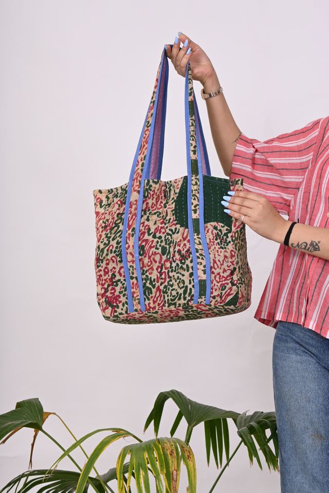 Handmade Cotton Kantha Reversible Tote Shoulder Bag Large Capacity Block Printed Quilted Shopping Bag Lightweight Durable Bulk