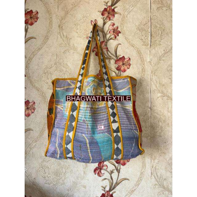 Handmade Cotton Large Floral Kantha Bag Reversible Quilted Tote with Geometric Folding Style Block Print Floral Design