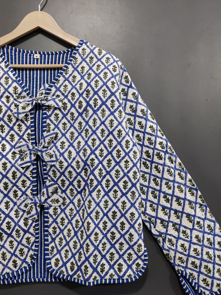 Handmade Bohemian Style Cotton Quilted Women's Jacket Long Sleeved Floral Stripe Printed Hand Block Knot Tie Closer Raw Free