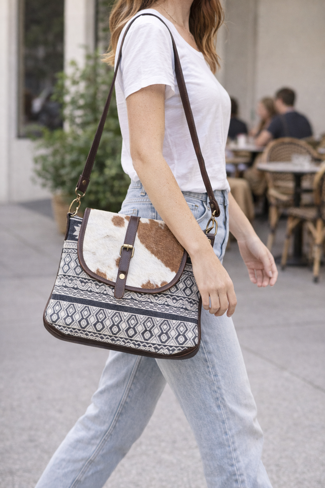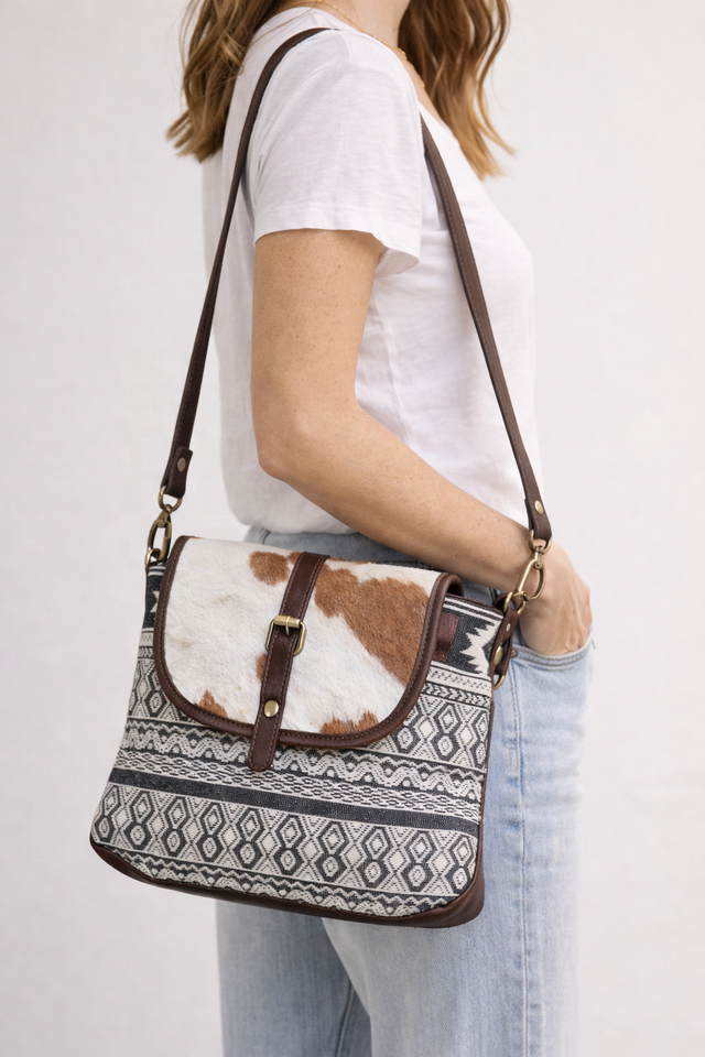 Handmade Cowhide Leather Canvas Crossbody Sling Bag Abstract Pattern Shoulder Bag with Chains Zipper for Women USA Ready Stock