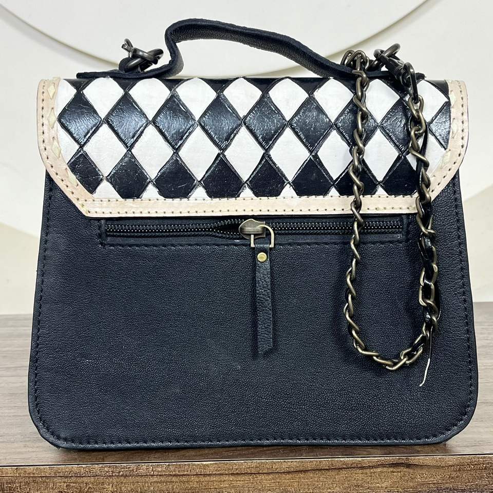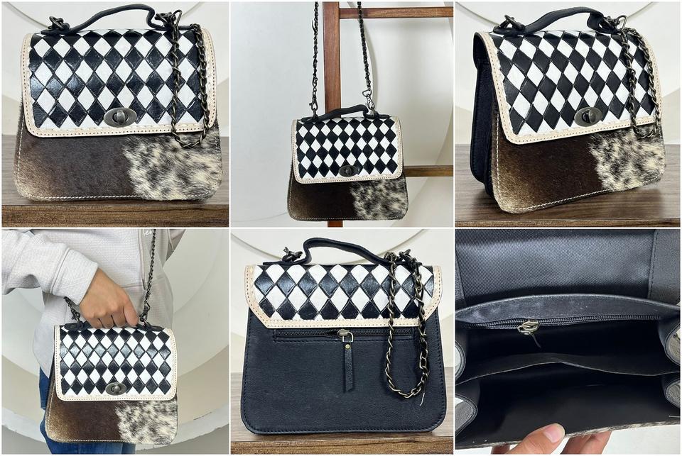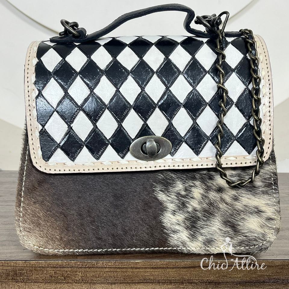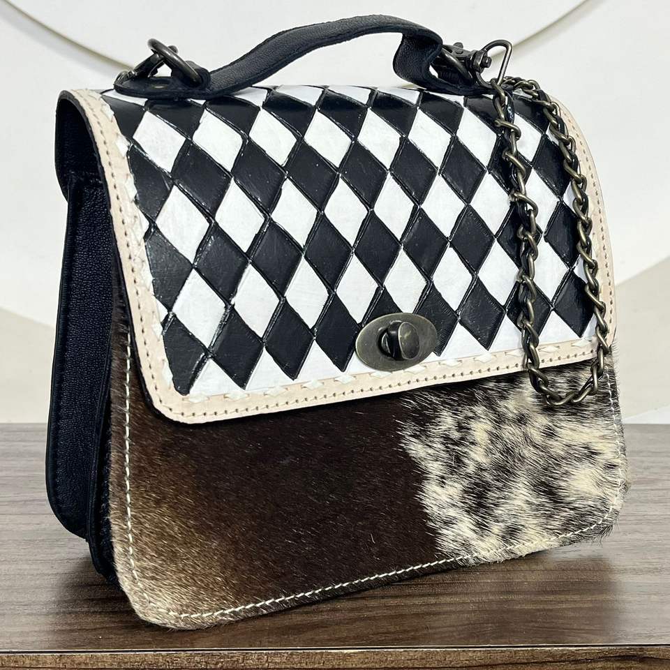 Handmade Cowhide Leather Crossbody Sling Bag Checkered Pattern Hair-on-Hide Shoulder Purse with Chain Strap Stylish & Durable