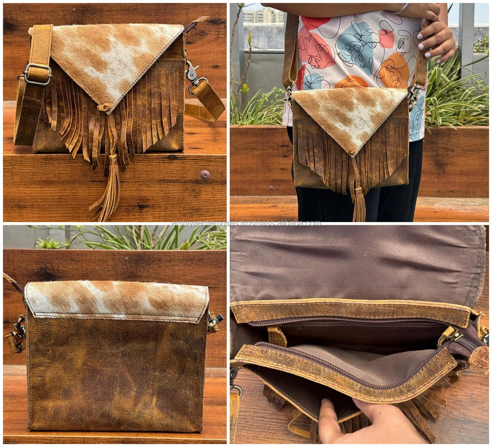Handmade Cowhide Leather Fringe Crossbody Bag Boho Western Style Shoulder Purse with Adjustable Strap Genuine Leather Handbags