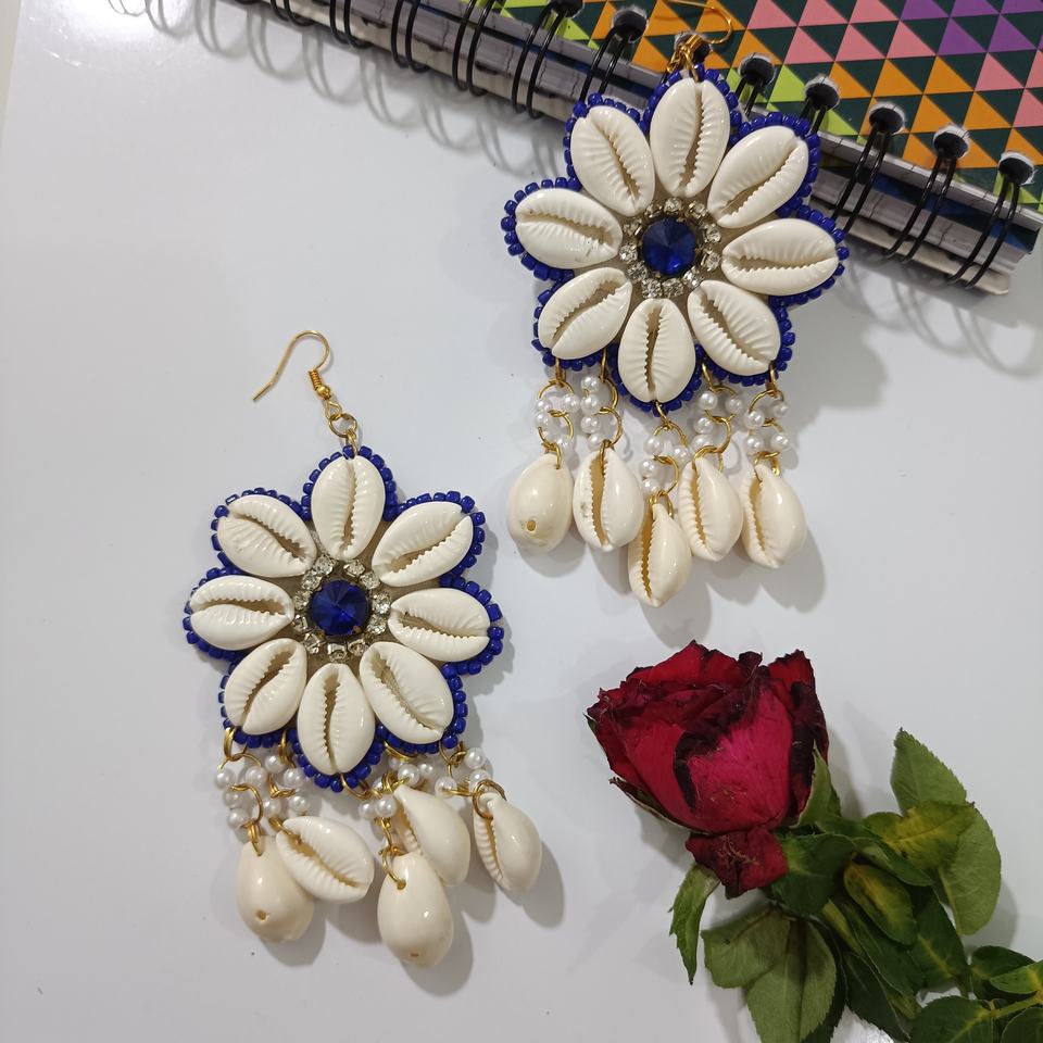 Handmade Cowrie Shell Flower Earrings with Blue Beads Ethnic Dangle Jewelry for Women Traditional Craft Boho Gift and Fashion