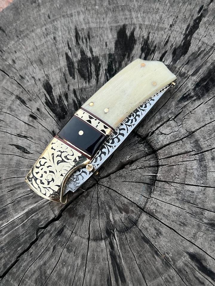 Handmade Custom 440C Damascus Stainless Steel Multi-Function Pocket Knife Bone Handle Everyday Carry Utility Knife OEM Available