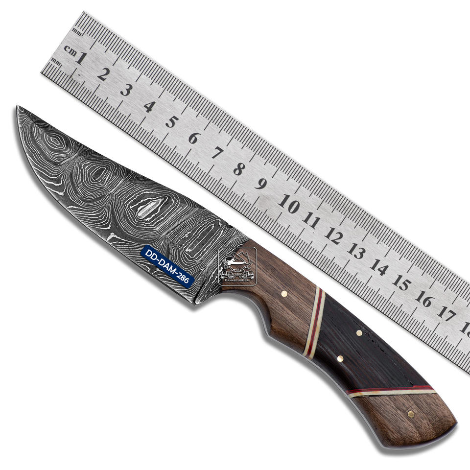 Handmade Customizable Hunting Knife Embossed Damascus Steel Blade High-Grade OEM Supported Sheath Olive Wood Handle DD-DAM-284