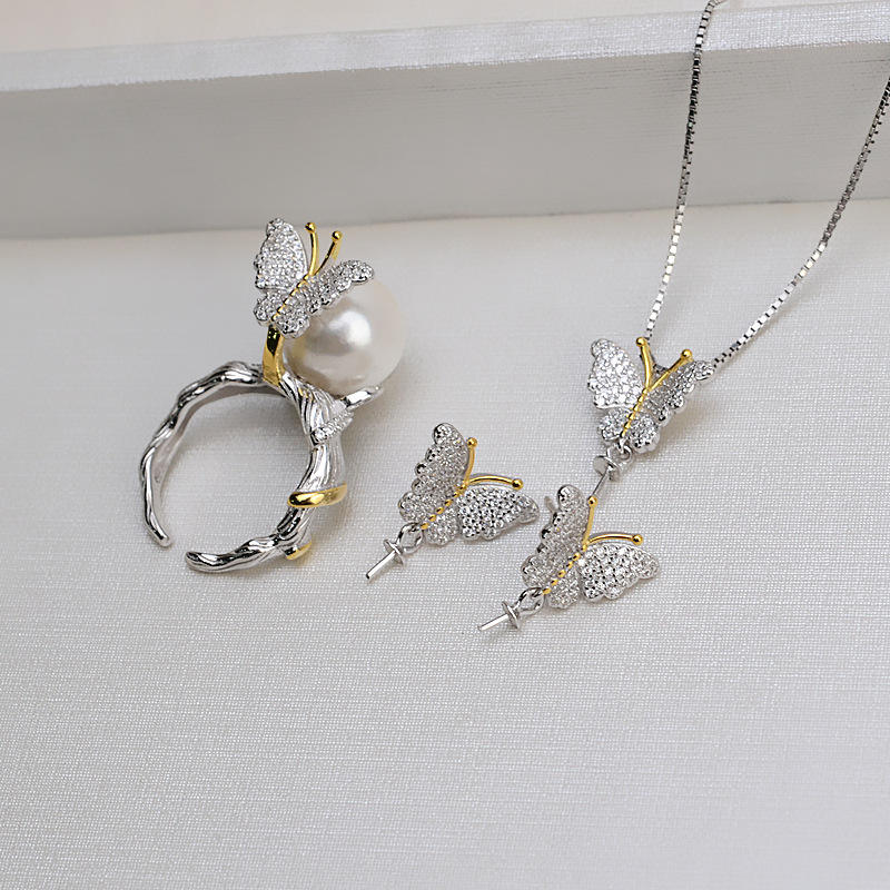 Handmade DIY S925 Silver Pendant Earnail Ring Butterfly Set Empty Stand 1336-Fashionable Pearl Jewelry Accessories