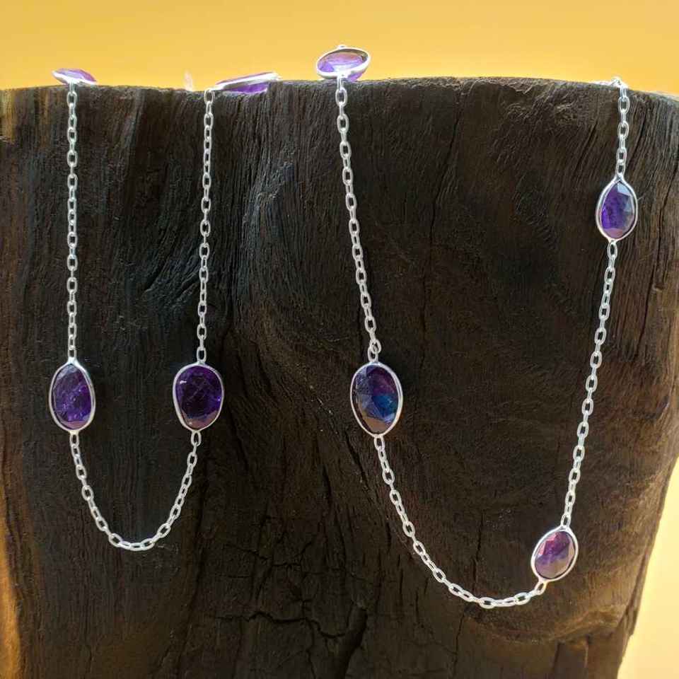 Handmade Dainty Amethyst Gemstone Necklace with Faceted 925 Sterling Silver Long Rope Chain