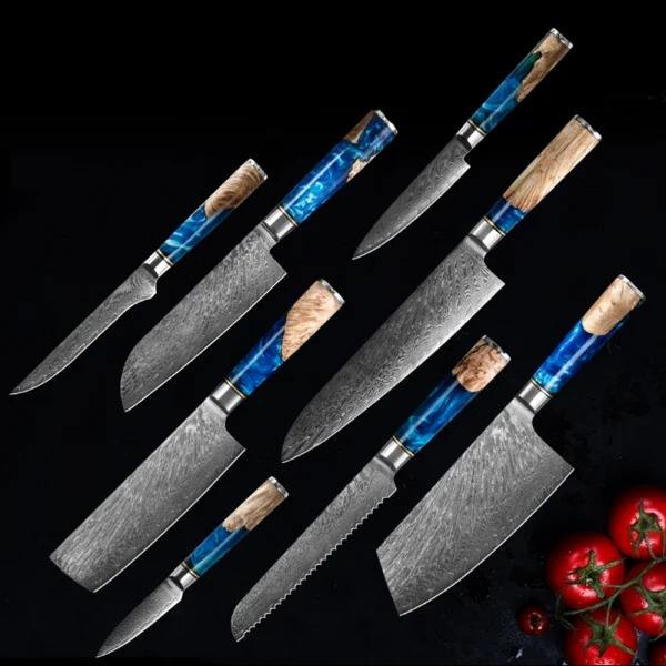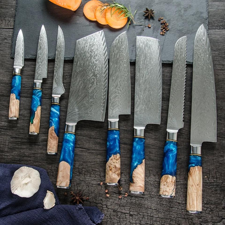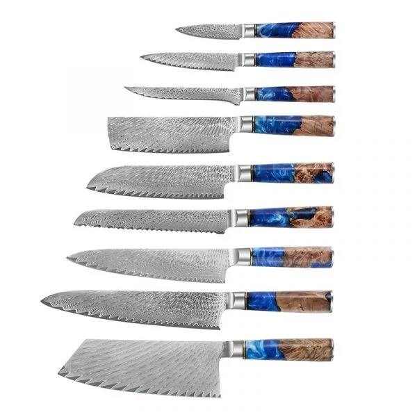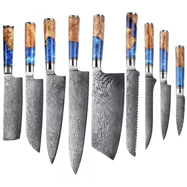 Handmade High Quality Damascus Steel Chef Knife Set 9-Pcs Ambidextrous Blue Resin Leather Sheath Kitchen Camping Survival Knives