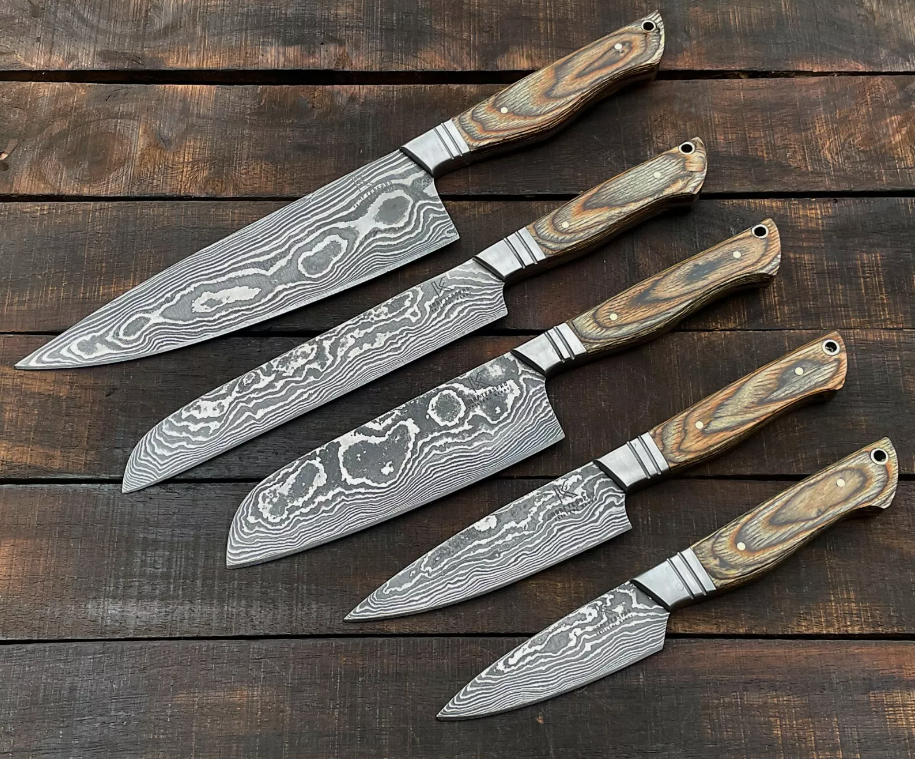 Handmade Damascus Steel 5-Piece Kitchen Set Carbon Steel Pure Leather Sheath Includes Chef Cleaver Bread Steak Fruit Sharpening