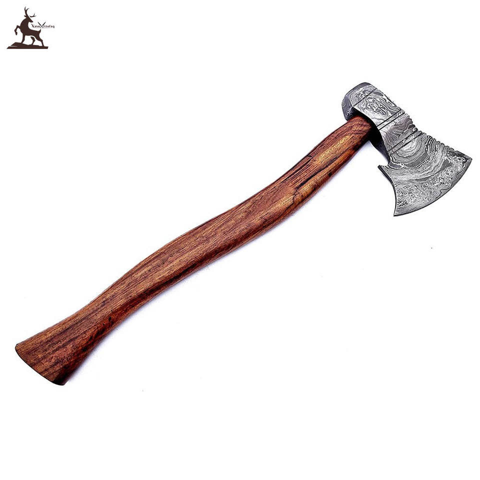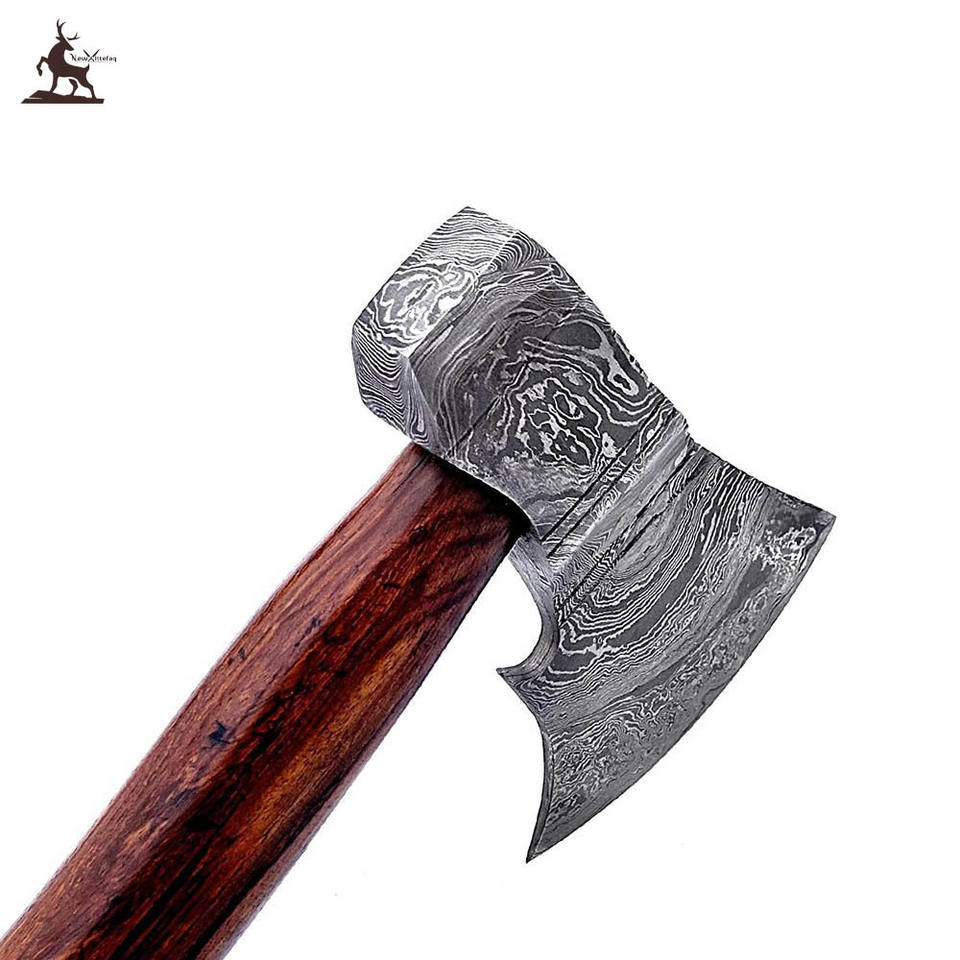 Handmade Damascus Steel Axe for Outdoor Camping and Tactical Wood Working Featuring a Wood Handle