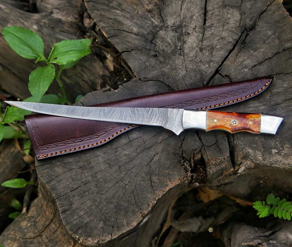 Handmade Damascus Steel Fillet Knives with Personalized Stainless Steel Sheath DIY Cutting Bone Handle for Anniversary