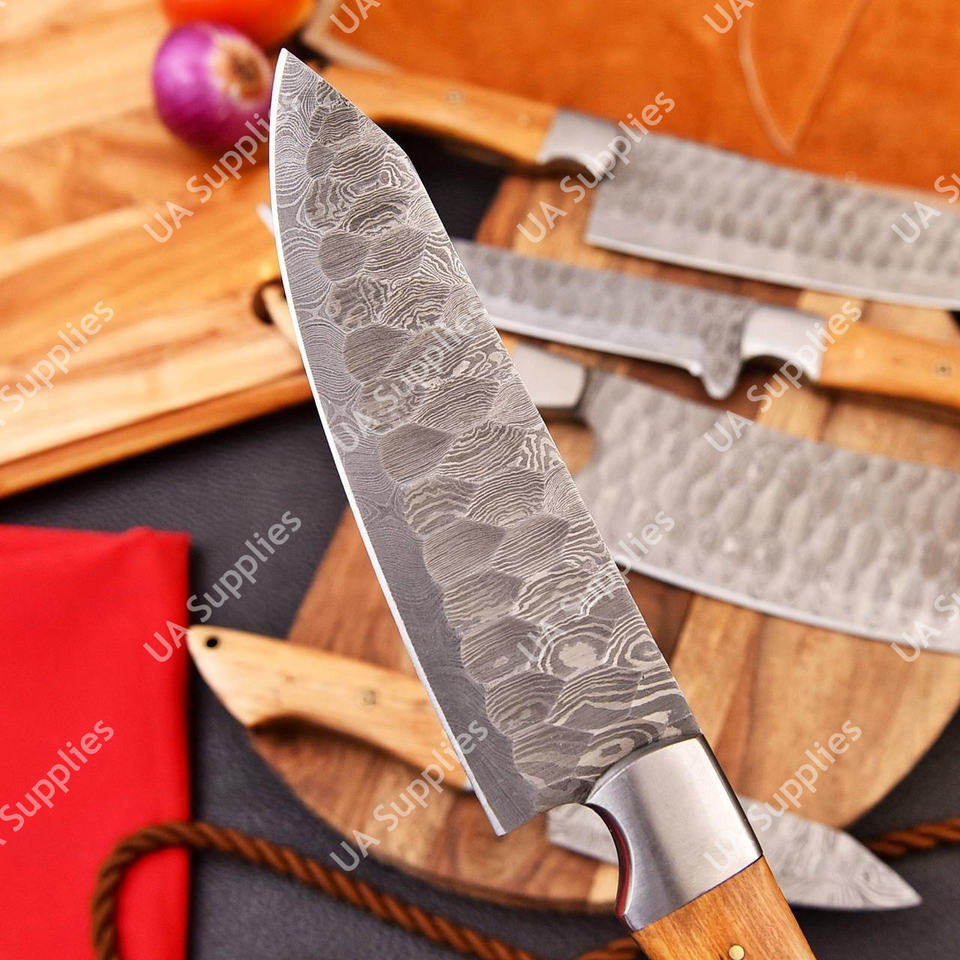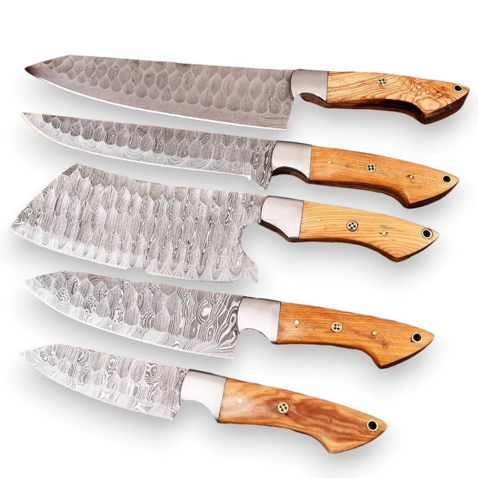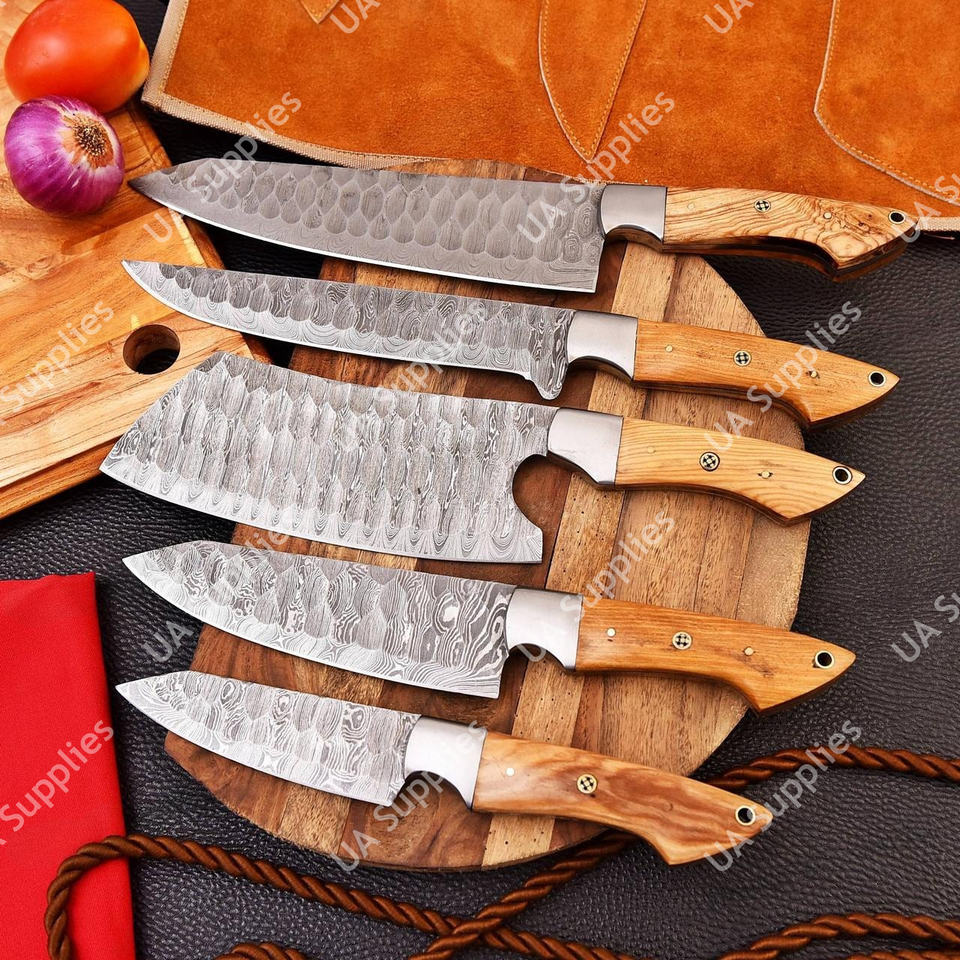 Handmade Damascus Steel Full Tang 5-Piece OEM OBMChef Knife Set Olive Burl Ergonomic Handle Leather Sheath (4.5-9" Blade Length)