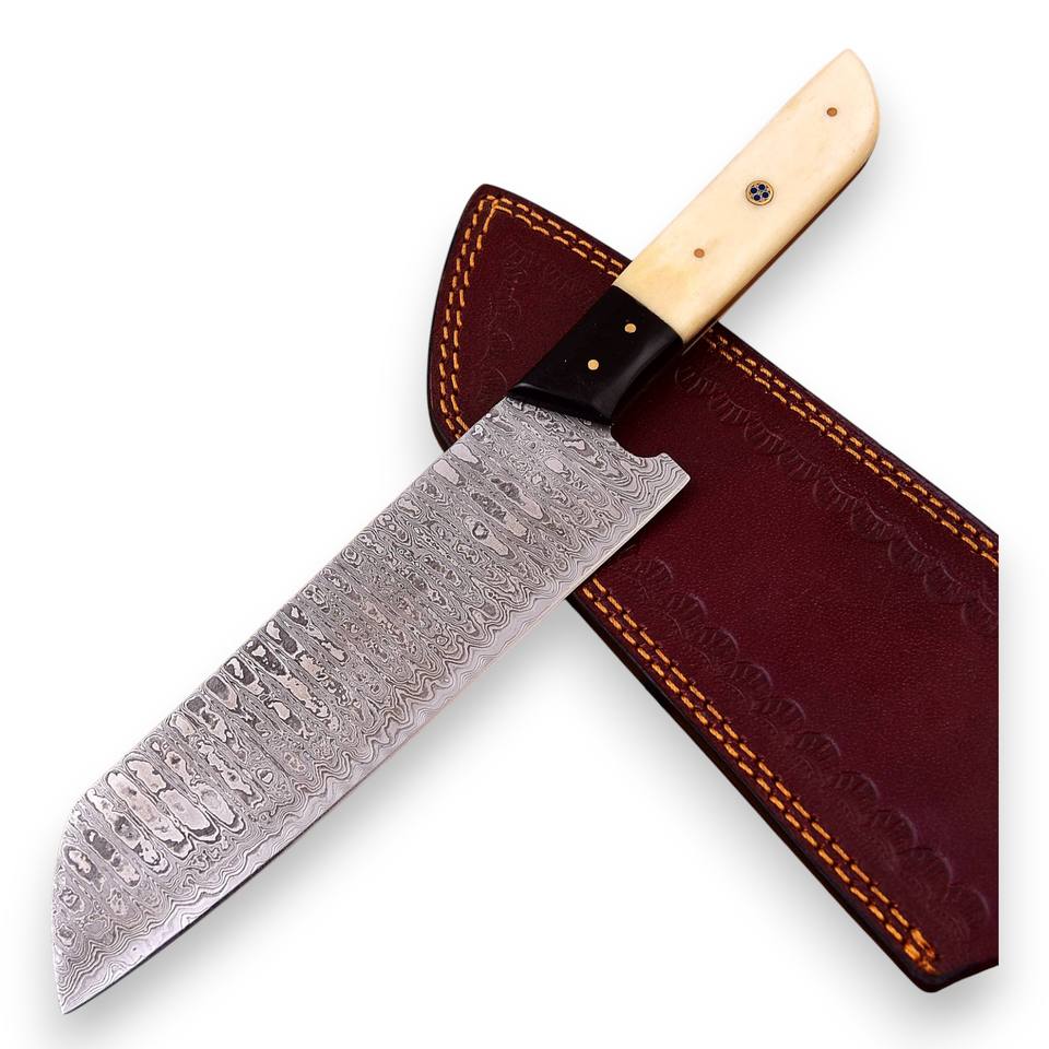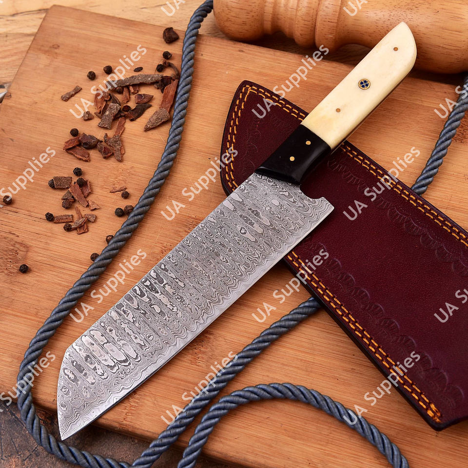 Handmade Damascus Steel Full Tang Lightweight Japanese Santuko Chef Knife 8-Inch Ergonomic Bone Epoxy Handle Ambidextrous OEM