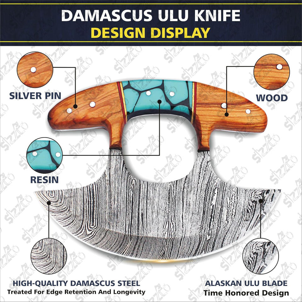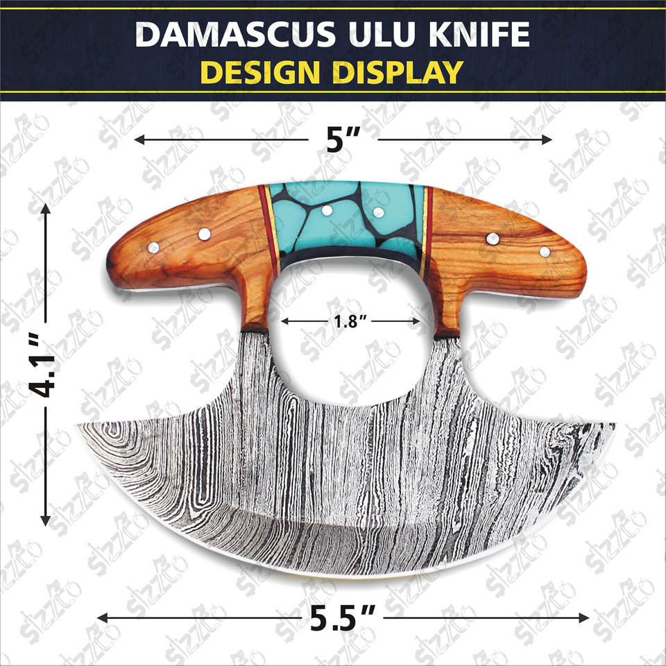Handmade Damascus Steel Ulu Knife with Wood Handle, Unique Pizza Cutter Chef Kitchen Knife, Perfect Anniversary or Birthday Gift