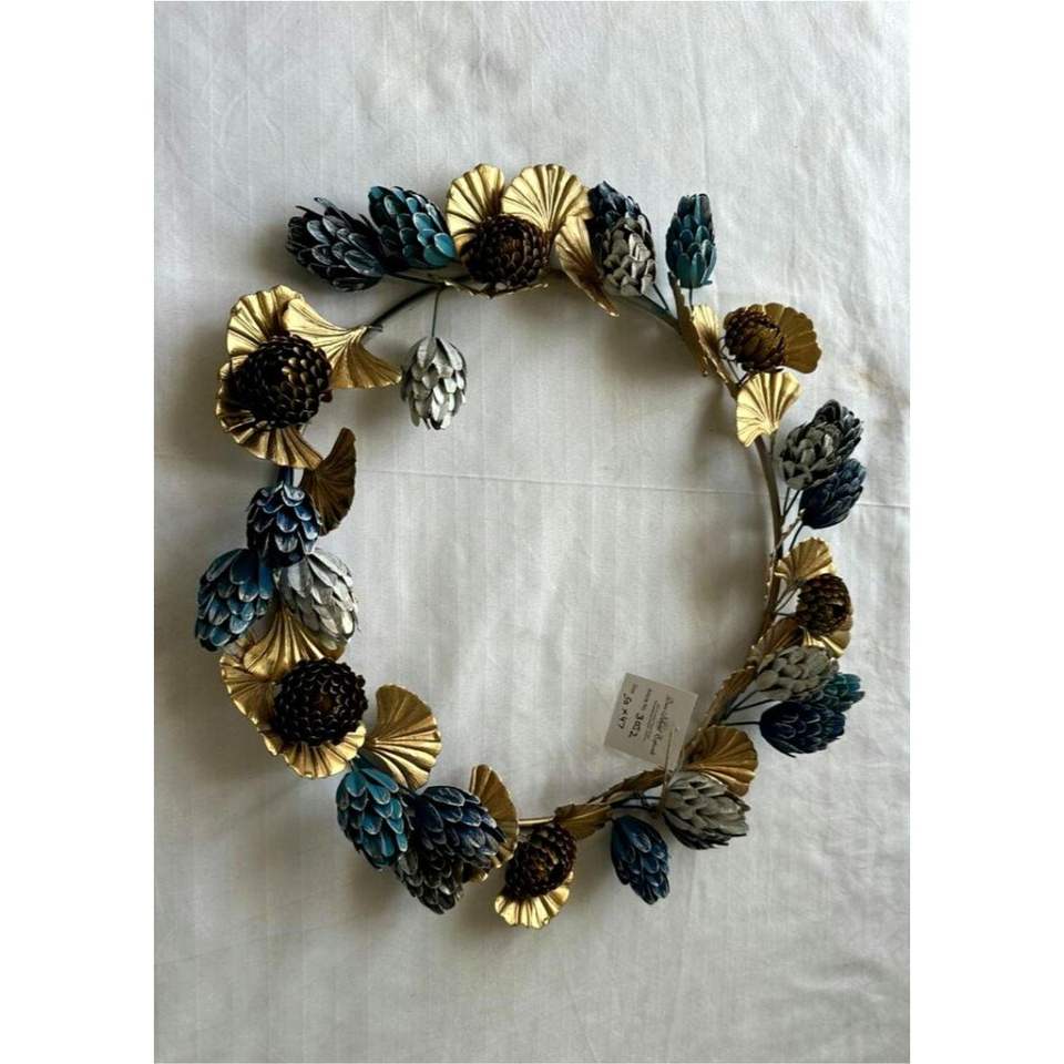 Handmade Decorative Metal Pinecone Wreath Wall Art Antique Gold Finished Iron Floral Garland for Festive Holiday, Office Decor