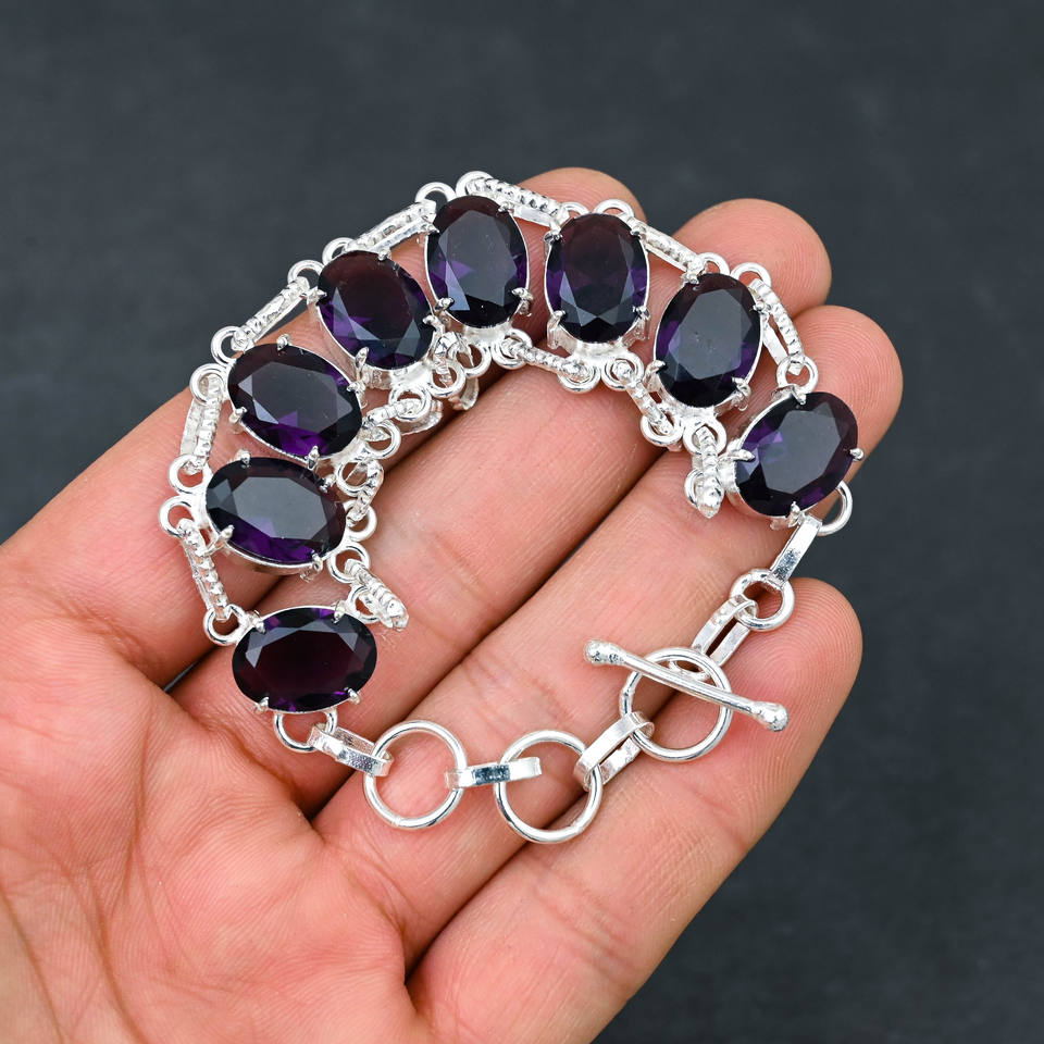 Handmade Designer 925 Silver Plated Lab-Created Purple Amethyst Gemstone Bracelet 7-8 Inches Fine Jewelry Chain Diamond Bangle