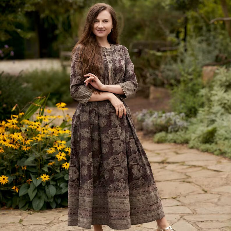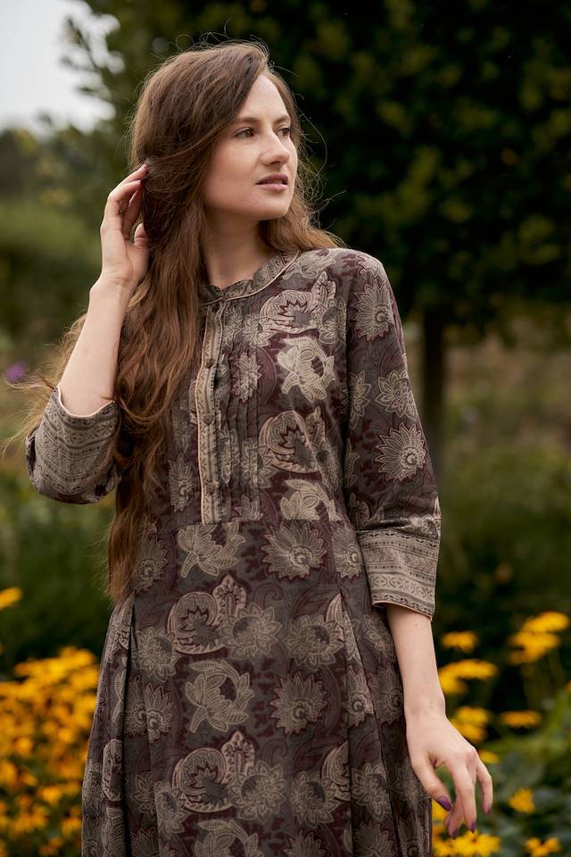 Handmade Dharati Dress Bohemian A Line Calf Length Hand Block Printed Pure Cotton Holiday Grey Brown