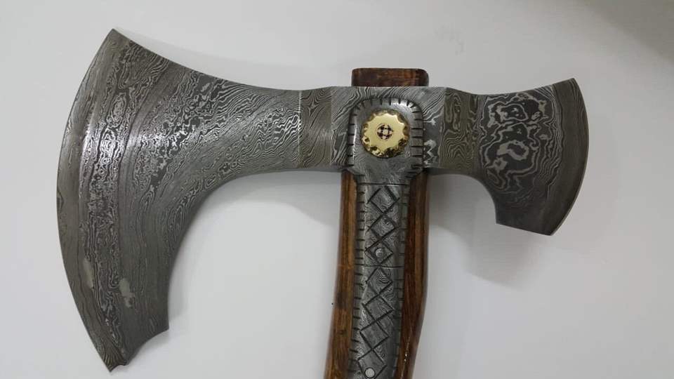 Handmade Double Head Viking axe with Beautiful Leather Sheet and Wrapping, Dmascuss Steel Axe Hatchet Outdoor Camping Tool