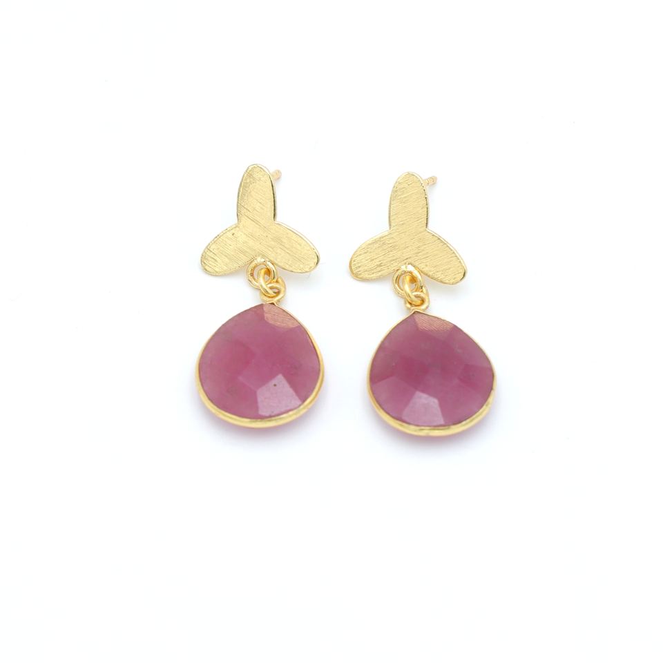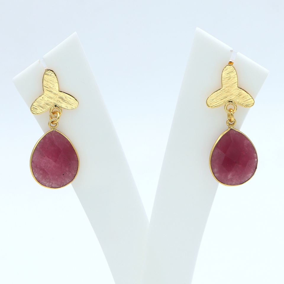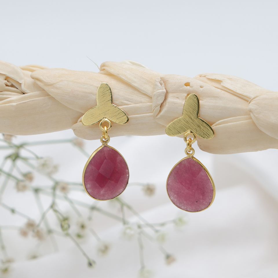 Handmade Dua Pink Jade Flower Pear Drop Earrings 18K Gold Plated Brass Trendy Elegant Natural Gemstone Women's Wedding Jewelry