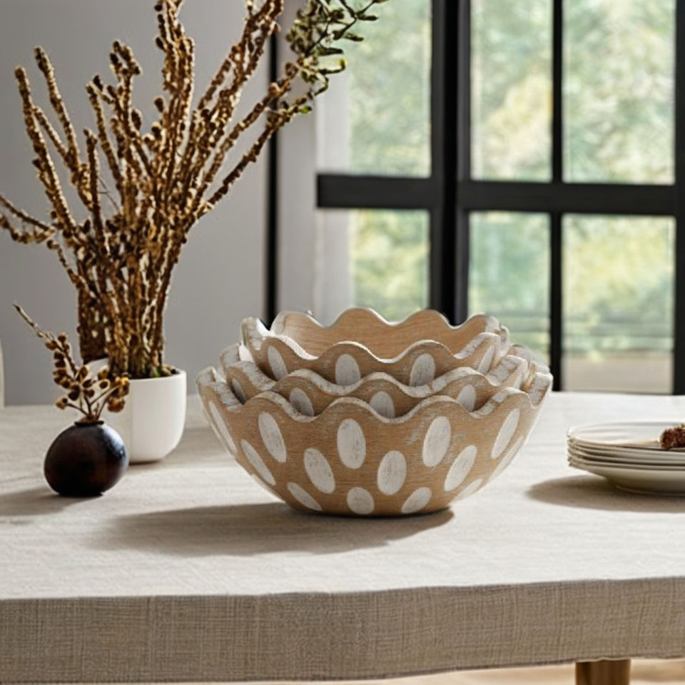 Handmade Durable Scalloped Wood Nesting Bowls Set Rustic White Polka Dot Decorative Serving Bowl Fruit Salad Home Decor