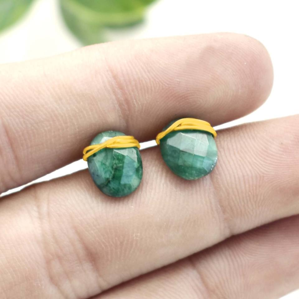 Handmade Dyed Emerald Wire-Wrapped Oval Stud Earrings 8-10mm Brass & Silver Gemstone Jewelry Gift