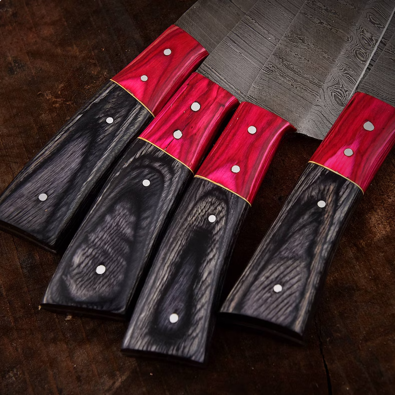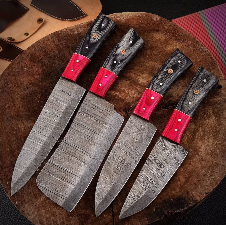 Handmade Eco-Friendly Damascus Steel 4-Piece Kitchen Knife Set Pure Leather Sheath Including Chef's Cleaver Steak Utility Carbon
