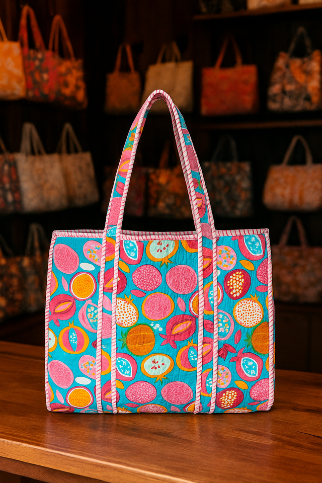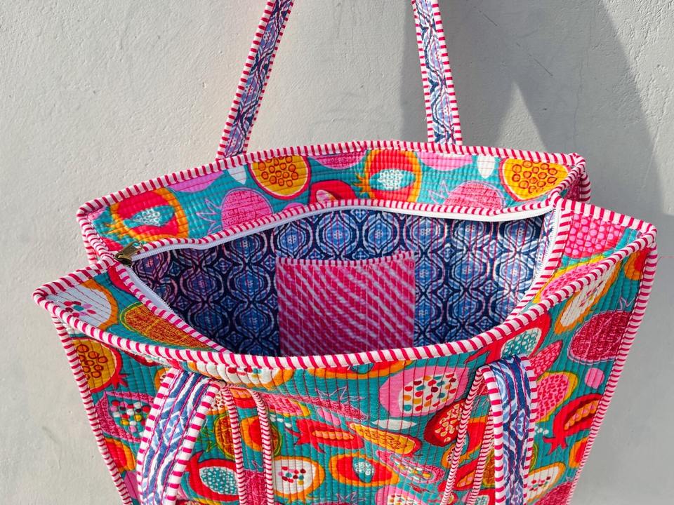 Handmade Eco-Friendly Large Quilted Cotton Tote Bag Floral Block Print Custom Zipper Lady Lightweight Inner Pockets Market