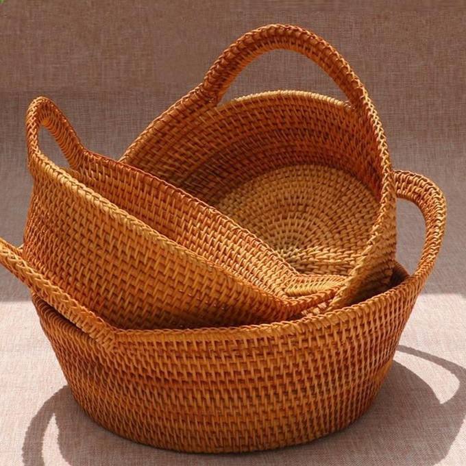 Handmade Eco Friendly Round Rattan Storage Basket with Handles Woven Bread Fruit Tray for Kitchen and Dining Table Decor