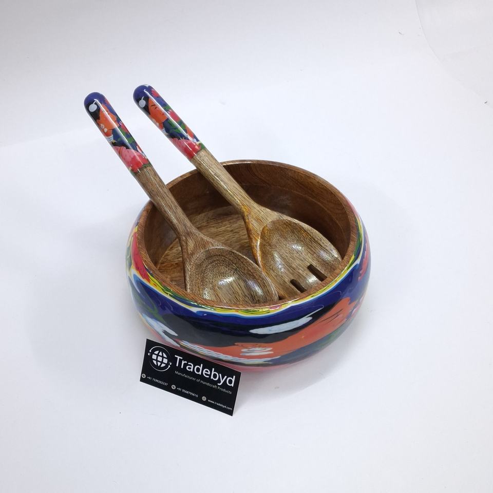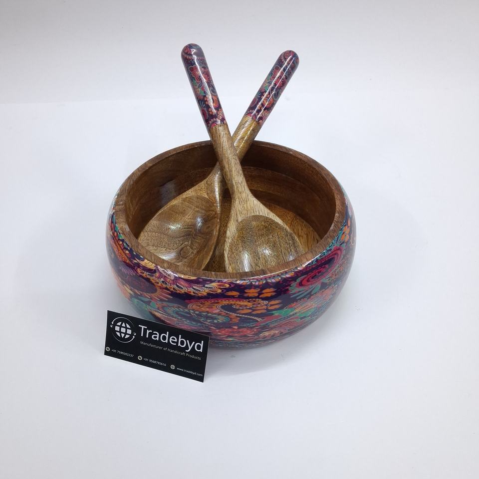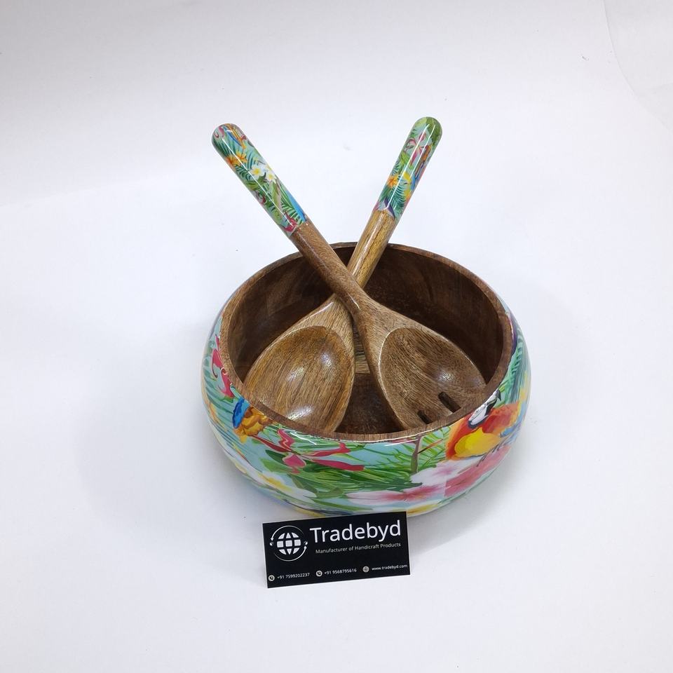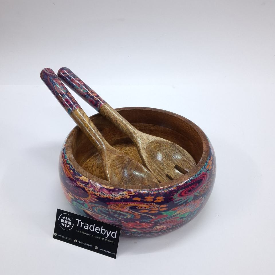 Handmade Eco-Friendly Wooden Salad Bowl with Sustainable Serving Spoon Enamel Print for Salads and More