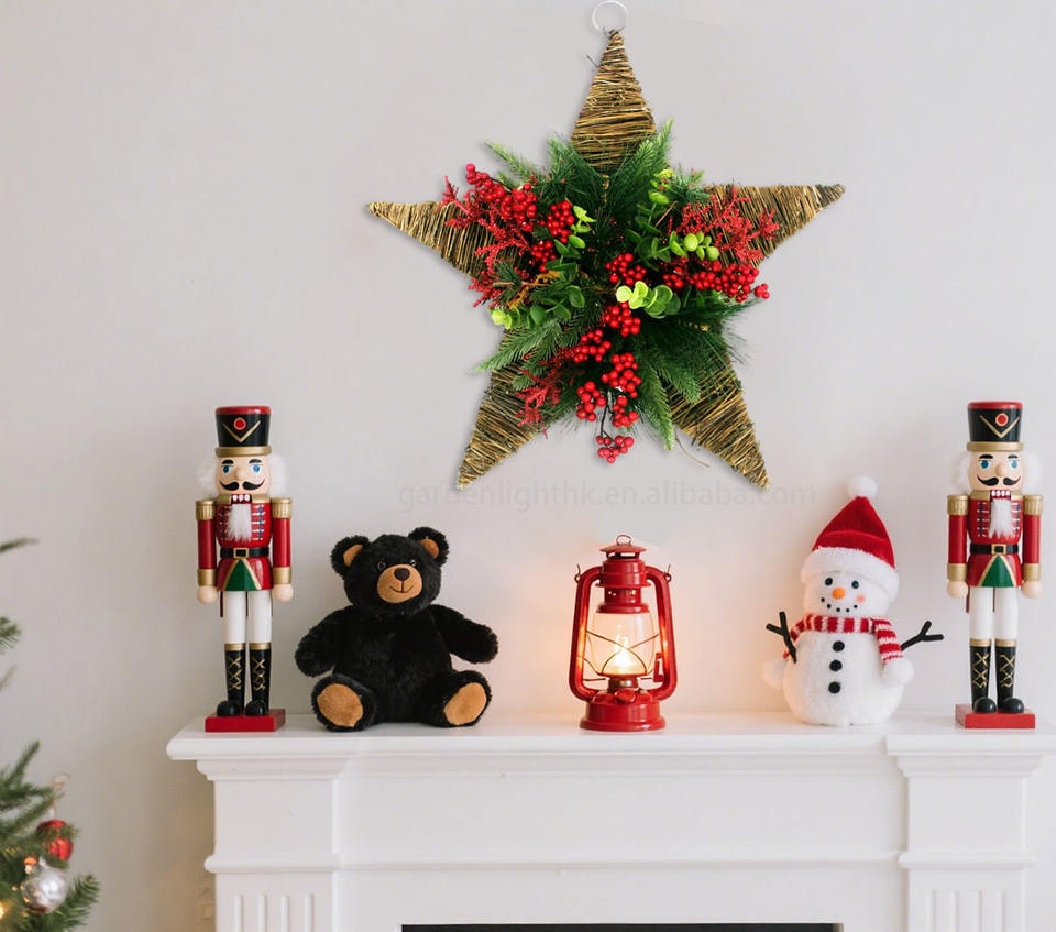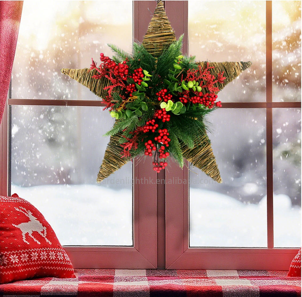 Handmade Eco-friendly Plastic Star Wreath Pine Branches Red Berries-Customizable Size Christmas Window Wall Decor Home Party