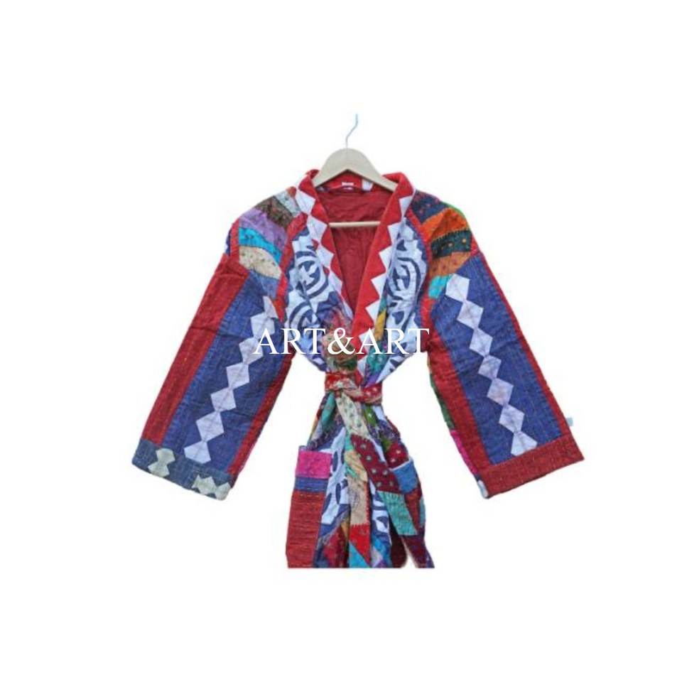 Handmade Elegant Vintage Kantha Short Kimono Robe 100% Cotton Luxury Floral Pattern Indian Quilt Smooth Summer Winter Autumn