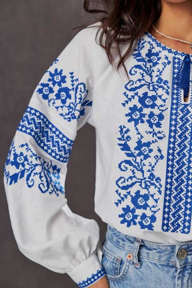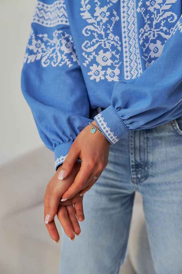 Handmade Summer Dress Embroidered Floral Blue White Ukraine Traditional Vishivanka V-neck off Shoulder A-Line Natural Waistline