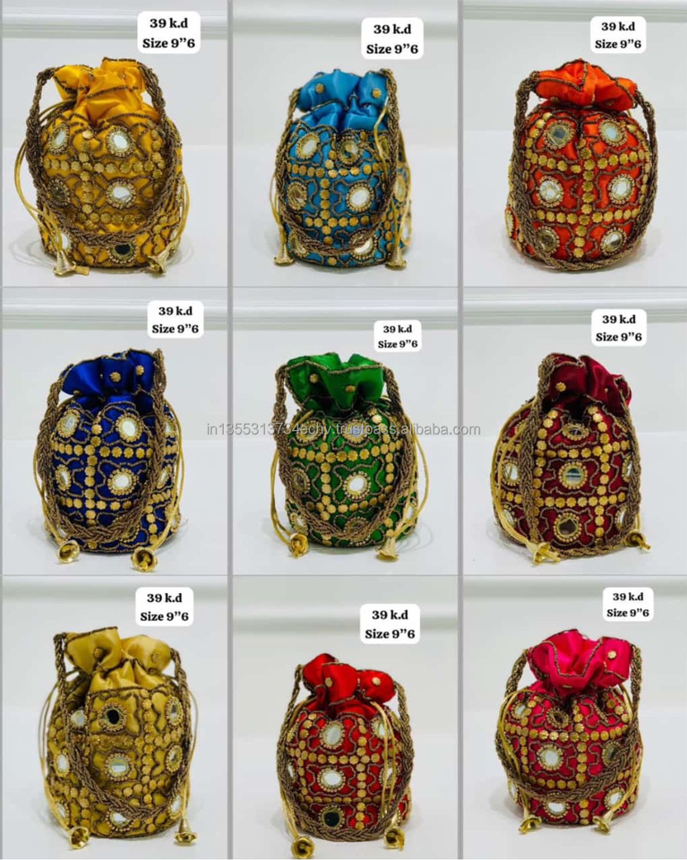 Handmade Embroidery Mirror Work Ethnic Indian Satin Lightweight Unisex Wedding Gift String Closure Clutch Bags