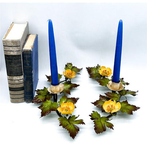 Handmade Enamel Floral Taper Candle Holder, Decorative Metal Flower Candlestick Set Wedding Centerpiece & Holiday Gift Decor