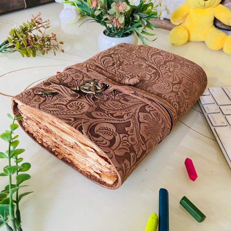 Handmade Floral Leather Bound Journal Diary A5 Size Green Vintage Deckle Edge Cotton Paper for Writing Sketching or As a Gift