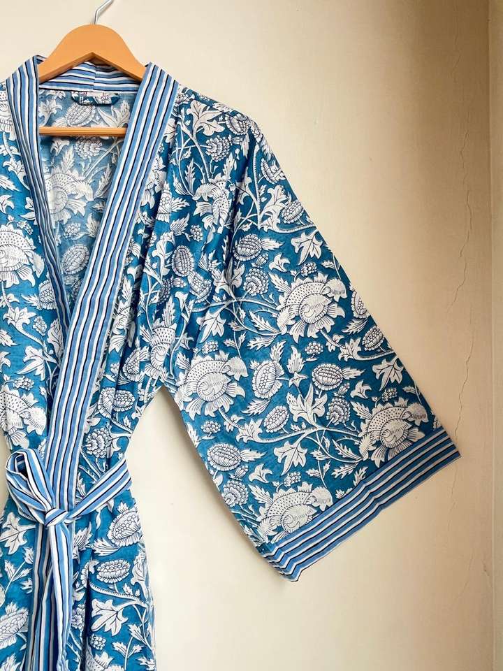Handmade Floral Print Cotton Gown Indian Resort Wear Cover Up Cotton Kimono Robe Dressing Block Print Bridesmaid Robe
