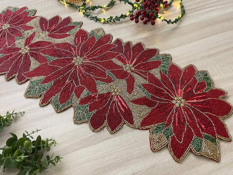 Handmade Floral Red Beaded Table Runner Customized Inch Sizes for Home and Hotel Festive Merry Christmas Decor Tabletop