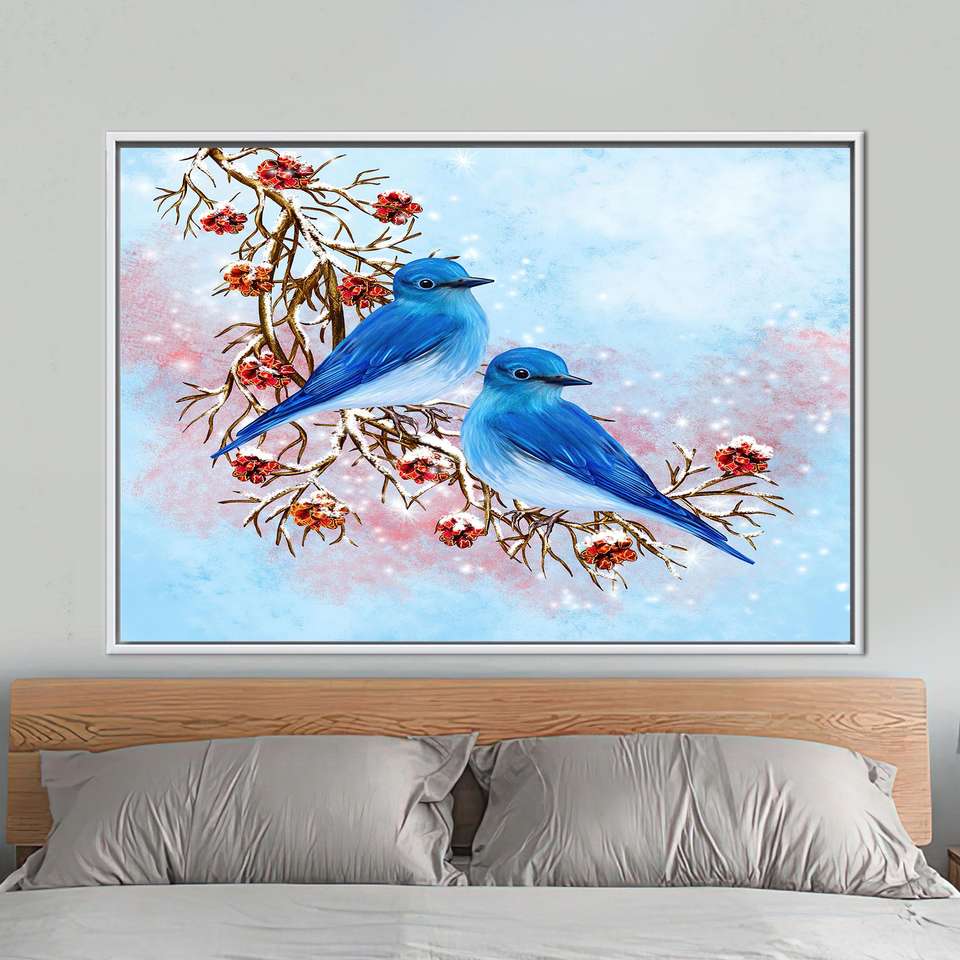 Handmade Gift: Blue Two Birds Painting Canvas Decor, Modern Printed Animal Art,1P:White Framed