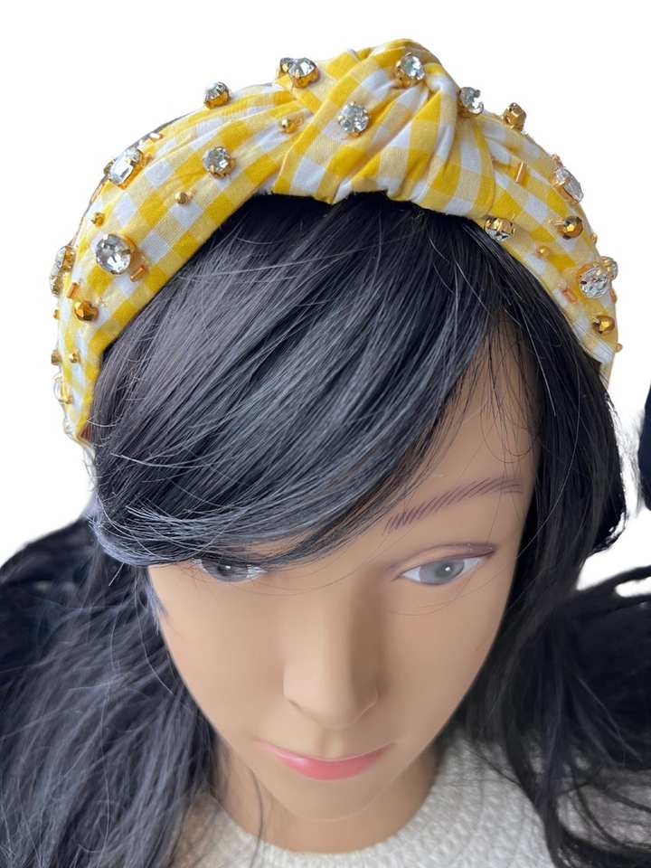 Handmade Gingham Jeweled Knot Headband Sunny Yellow Game Day Headband, Perfect School Football Accessories for Women & Girls