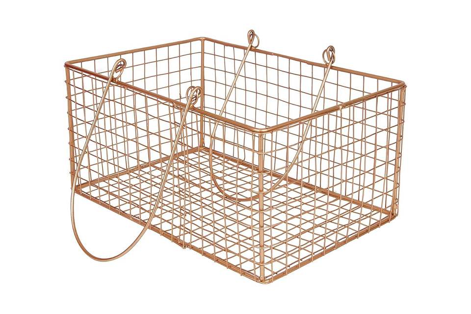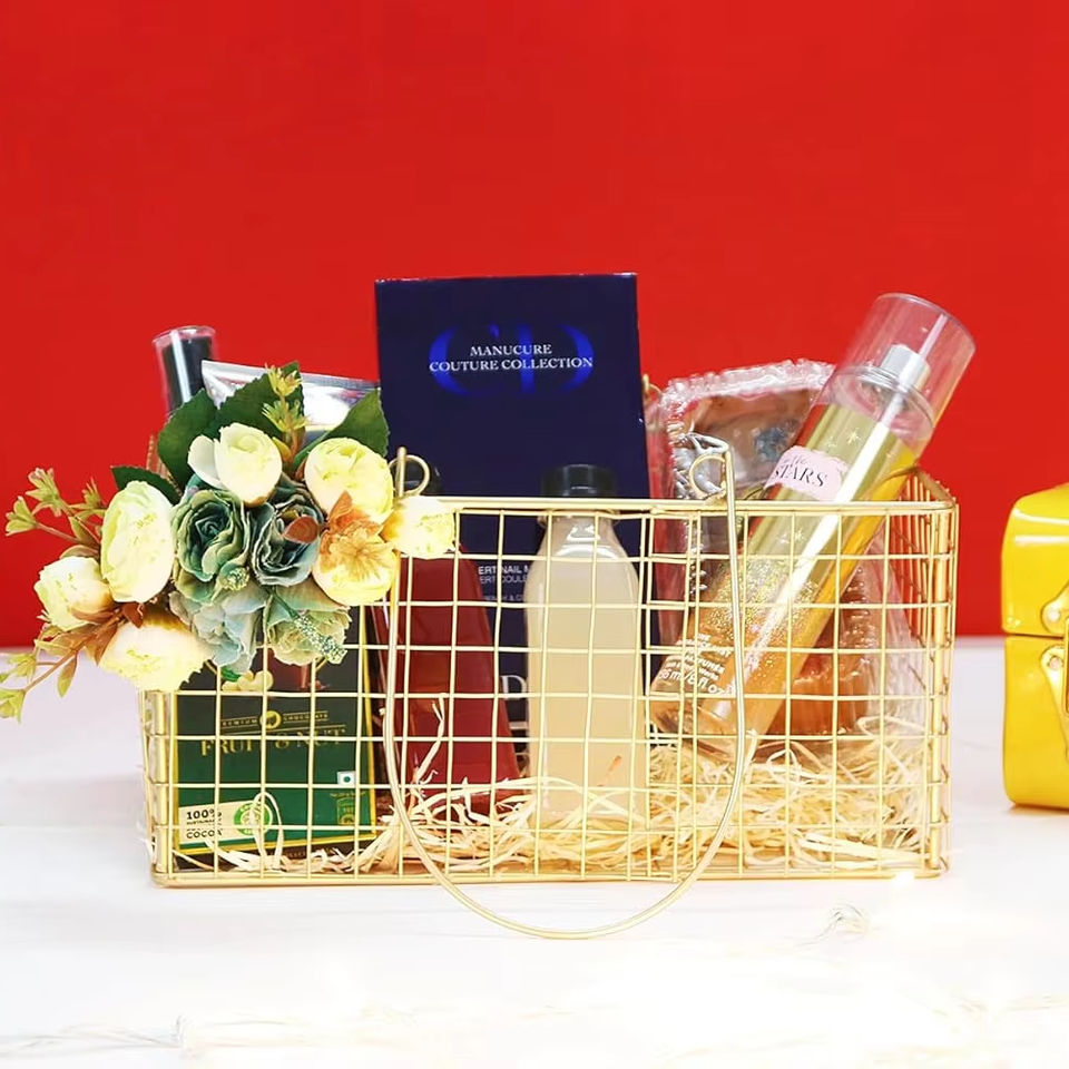 Handmade Gold Metal Gift Display Basket with Handle Wicker Fruit Flower Organizer for Kitchen or Bathroom Storage